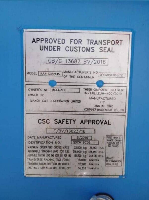 Product Reference: 227240ft long x 8ft wide x 8ft 6 high9ft 6 high cube options alsoavailable hereFor site storage or export useCirca 5 year CSC plate (for export use)High security lock boxes on both doorsBlue and Green optionsGuaranteed wind & watertightOriginal shipping container doors at both ends with 4 locking rods and heavy duty rubber seals